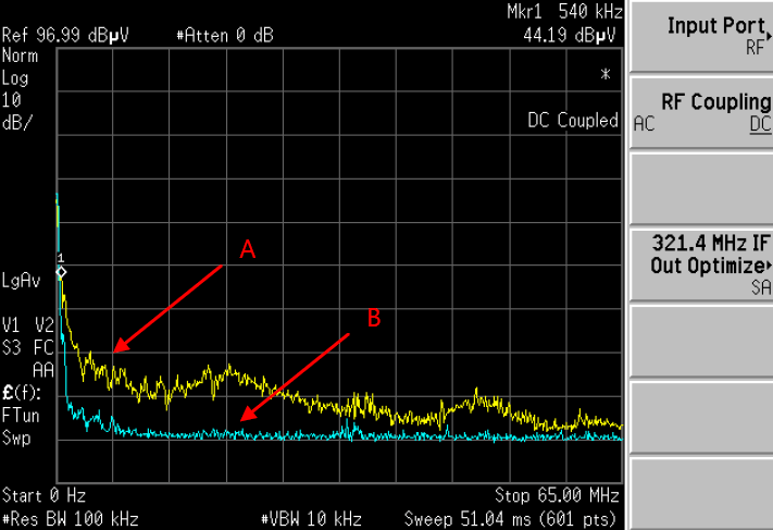 Fuente de alimentación conmutada de KRECO con conector F suprime eficazmente ruido espúreo, a través de la prueba de ruido espúreo .